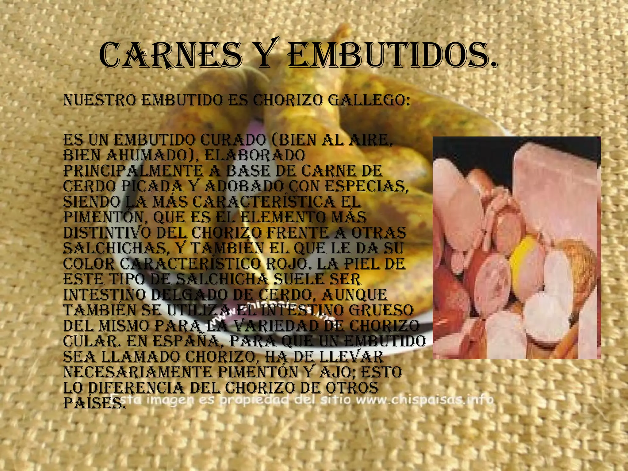 El documento describe el chorizo gallego, un embutido curado hecho principalmente de carne de cerdo picada y adobada con especias como el pimentón. Explica la historia del chorizo desde sus orígenes en la prehistoria hasta su popularidad en la antigua Roma y su posterior expansión a Europa y América. También incluye una receta detallada para hacer chorizos caseros rellenando tripas naturales con la mezcla de carne y especias.