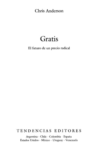 Este documento es el prólogo del libro "Gratis" de Chris Anderson. Resume cómo Monty Python lanzó sus videos de forma gratuita en YouTube para promocionar la venta de sus DVDs, lo que resultó en un aumento masivo de las ventas. Explica que muchos servicios e Internet son gratuitos a pesar de que empresas como Google son muy rentables, lo que plantea una paradoja sobre cómo ganar dinero ofreciendo cosas gratis. El prólogo introduce el tema central del libro sobre cómo se ha creado una gran economía basada en precios cercanos a