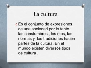 Este documento trata sobre la cultura, el emprendimiento y el emprendedor. Define la cultura como el conjunto de expresiones de una sociedad que incluye costumbres, ritos, normas y tradiciones. Describe el emprendimiento como una manera de pensar ideas para generar riqueza orientada a las oportunidades. Finalmente, define al emprendedor como una persona que enfrenta problemas económicos, de negocios y financieros con buenas estrategias.