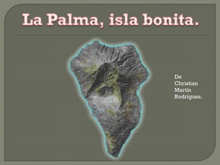 Este documento resume las características geográficas, históricas y culturales de la isla de La Palma. La isla tiene una superficie de 708 km2 y una población de 87.324 habitantes. Geológicamente es de origen volcánico, con erupciones históricas registradas desde el siglo XV. Presenta diversos paisajes y ecosistemas protegidos que albergan especies endémicas. Los aborígenes estaban divididos en 12 cantones y su economía se basaba en la ganadería y recolección.