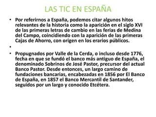 Este documento describe brevemente la historia de la banca, desde los asirios y romanos hasta el siglo XVI en España, cuando aparecieron las primeras letras de cambio en ferias y las primeras cajas de ahorro. También menciona algunos hitos importantes en la historia bancaria española como el banco más antiguo fundado en 1776 y el Banco de España establecido en 1856.