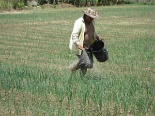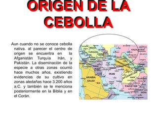 La cebolla se originó probablemente en el centro de Afganistán, Turquía, Irán y Pakistán, y se ha cultivado desde hace 3200 años a.C. Actualmente, China es el principal productor mundial, mientras que Colombia produce 276,300 toneladas anualmente pero también importa 70,000 toneladas, principalmente de Ecuador, Perú, Venezuela y Chile. El documento proporciona detalles sobre los requerimientos nutricionales y recomendaciones de fertilización para el cultivo de cebolla.