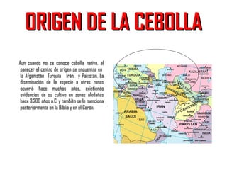 La cebolla se originó probablemente en el centro de Afganistán, Turquía, Irán y Pakistán, donde se han encontrado evidencias de su cultivo hace 3,200 años. Actualmente es la segunda hortaliza más consumida y producida en el mundo. Aunque Colombia produce 276,300 toneladas anuales en 12,424 hectáreas, también importa 70,000 toneladas al año, principalmente de Ecuador, Perú, Venezuela y Chile.