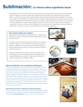 El documento describe los procesos y productos involucrados en la sublimación, un método para transferir imágenes a superficies rígidas sin pasar por el estado líquido. Explica que Universal Woods ofrece una variedad de sustratos como aluminio, madera y plástico con recubrimientos especiales para recibir impresiones sublimadas de alta definición. También promueve sus marcas Chromaluxe, Unisub y SwitchCase, las cuales ofrecen más de 580 productos sublimables para crear regalos, accesorios y más.