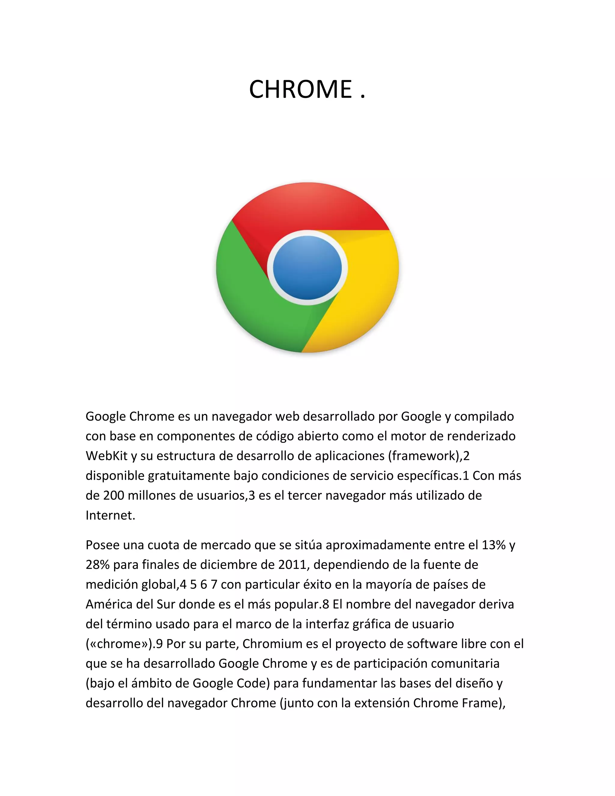 Google Chrome es un navegador web gratuito desarrollado por Google y basado en componentes de código abierto como WebKit. Con más de 200 millones de usuarios, es el tercer navegador más utilizado en Internet y tiene una cuota de mercado global que varía entre el 13% y 28%. El proyecto de código abierto Chromium es la base de desarrollo de Chrome y del sistema operativo Chrome OS.