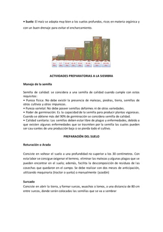 Este documento describe las actividades de preparación del suelo y siembra del cultivo de chullpi (Zea mays amylosaccharata). Incluye información sobre el marco teórico, requerimientos del cultivo, preparación del suelo, manejo de la semilla, siembra, y prácticas culturales como raleo, deshierba y riego. El objetivo general fue preparar el suelo y sembrar correctamente este cultivo nativo andino siguiendo los procedimientos adecuados.