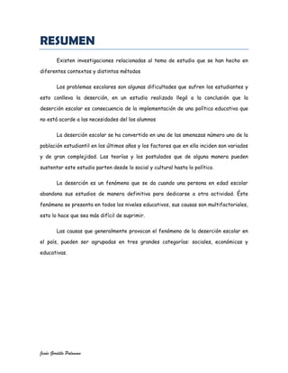 El documento describe la importancia de realizar un estudio sobre los índices de reprobación y deserción escolar en México. Existen múltiples factores que contribuyen a la deserción, incluyendo dificultades académicas, necesidad de trabajar para apoyar económicamente a la familia, bajo nivel educativo de los padres, y violencia familiar. Los problemas escolares son consecuencia de una política educativa que no satisface las necesidades de los estudiantes.
