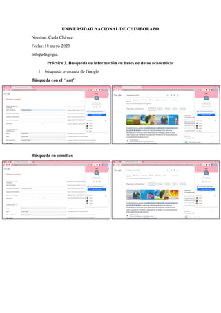Este documento presenta las instrucciones para una práctica de búsqueda de información en bases de datos académicas. La práctica incluye realizar búsquedas avanzadas en Google y capturar imágenes de recursos relacionados a la realidad aumentada encontrados en varias bases de datos y sitios web como repositorios institucionales, YouTube, Pinterest y Amazon.