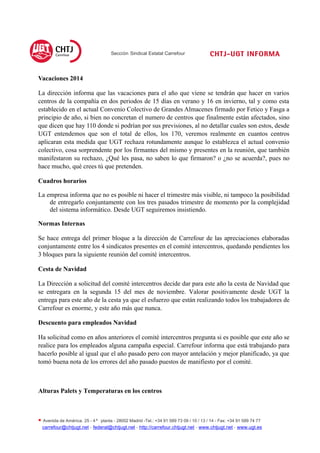 El documento resume las discusiones de una reunión del Comité Intercentros de Carrefour. Se discutió el cumplimiento de los acuerdos sobre los horarios y días de descanso, las vacaciones de 2014 que se tomarán en dos periodos, y las fechas de los inventarios generales que aún no se han determinado. La dirección también informó sobre incentivos, seguimiento profesional y descuentos para empleados durante la Navidad.