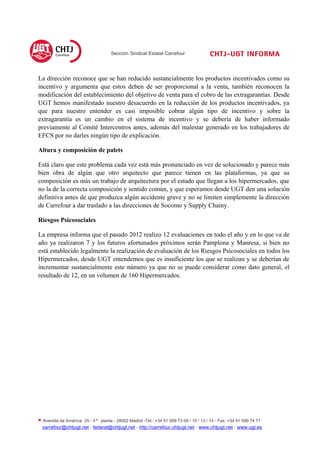 El documento resume las discusiones de una reunión del Comité Intercentros de Carrefour. Se informó que los centros de Carrefour en Madrid permanecerán cerrados el 1 de mayo. También se acordó un plan de jubilaciones parciales y se discutió sobre la compensación de horas extras, normas internas, recogida de carros, incentivos para empleados y evaluaciones de riesgos psicosociales.