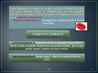 Este documento describe la cianosis, definida como la coloración azul oscura o purpurica de la piel, mucosas y lechos ungueales. Puede deberse a bajos niveles de oxígeno en la sangre causados por problemas pulmonares, cardiovasculares o hematológicos, o la presencia de pigmentos anómalos como la metahemoglobina o la sulfohemoglobina. La cianosis se confirma generalmente mediante un análisis de gases en sangre u oximetría de pulso.