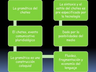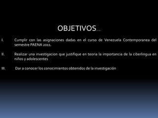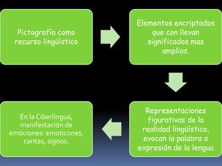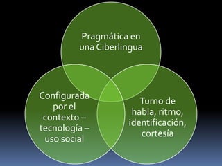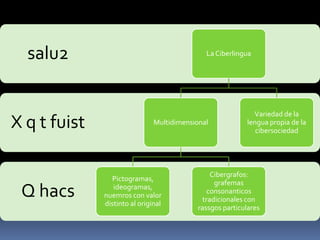 Este documento analiza la importancia de la ciberlingua para niños y adolescentes. Explora cómo la ciberlingua se ha convertido en una nueva variedad de lenguaje que coexiste con la oralidad y la escritura tradicional. Describe cómo en los mensajes escritos en línea a menudo se omiten letras y acentos. Concluye que la ciberlingua tiene sus propias convenciones de comunicación distintas del lenguaje común, con una presencia oral y abreviaciones.
