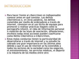 El documento habla sobre el curso de derecho informático. Explica conceptos como cibercrimen, delitos informáticos y malware como troyanos, gusanos y ransomware. También resume la Ley No 30096 de Perú sobre delitos informáticos y establece penas para conductas como acceso no autorizado a sistemas, daño a datos, interceptación de comunicaciones e identidad falsa.