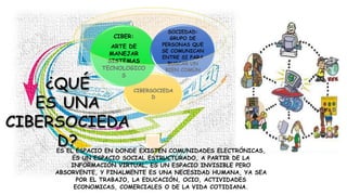 El documento habla sobre la cibersociedad. Define la cibersociedad como el espacio donde existen comunidades electrónicas y es un espacio social estructurado a partir de la información virtual. Explica que la cibersociedad no es solo una red de ordenadores, sino el resultado de la actividad social de los usuarios conectados entre sí en todo el mundo. Finalmente, señala algunas ventajas de la cibersociedad como el conocimiento y contacto que brinda a través de la red de forma accesible.