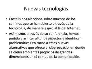 El documento resume las reflexiones sobre el ciberespacio y las nuevas tecnologías presentadas en la conferencia de Manuel Castells. Se destacan las nuevas interconexiones espacio-temporales que permiten el ciberespacio, así como su potencial para difundir conocimiento y dinamizar mercados. No obstante, también plantea desafíos como la brecha digital y el control sobre datos personales. El documento concluye analizando el ciberespacio como un fenómeno cultural global con impactos locales que transforma paradigmas sociales según Castells y otros autores.