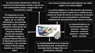 Un documento electrónico es información creada en una computadora como texto, imágenes o audio. El hipertexto permite organizar y enlazar información de diversas fuentes a través de vínculos internos, permitiendo leer el contenido de forma no lineal. La interactividad se refiere a la comunicación entre personas, máquinas y contenido, mientras que la noticia digital es un documento multimedia creado en software que puede ser leído e interactuado de manera no lineal por el usuario.