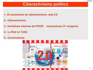 El documento habla sobre el ciberactivismo político y las iniciativas del PSOE para aprovechar las nuevas tecnologías. Explica el surgimiento de la Web 2.0 y cómo esto llevó al ciberactivismo, donde los ciudadanos usan Internet y redes sociales para participar políticamente. También describe cómo el PSOE creó la figura del "cibermilitante" para permitir la participación online, y sus esfuerzos para estar presente en plataformas como blogs, redes sociales y comentarios digitales. El objetivo final es mejorar la pre