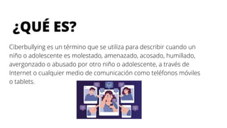 El documento define el ciberacoso como cuando un niño o adolescente es molestado, amenazado, acosado, humillado o abusado por otro a través de Internet o dispositivos móviles. Ofrece consejos para prevenir el ciberacoso como comunicarse de forma apropiada, mantener la privacidad, respetar a los demás y reportar malos comportamientos. Presenta el caso real de Amanda Todd, quien se suicidó a los 15 años luego de que una foto suya en topless tomada a los 12 años fuera difundida en Internet y usada