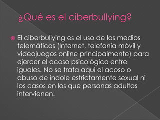 Este documento habla sobre el ciberacoso o ciberbullying, definido como el acoso psicológico entre iguales a través de Internet, teléfonos móviles y videojuegos online. Explica que involucra amenazas, hostigamiento y humillación de un menor a otro mediante tecnología. También menciona que puede tomar muchas formas limitadas sólo por la imaginación, y aconseja ser cuidadoso con la información que se comparte online para evitar ser victimizado.