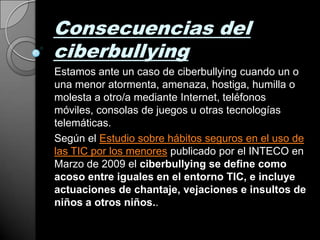 El documento describe el ciberacoso o ciberbullying, definido como el acoso psicológico entre iguales a través de Internet, teléfonos móviles y videojuegos online. Incluye chantaje, vejaciones e insultos entre niños. Las consecuencias pueden ser graves y la prevención requiere ignorar provocaciones, pedir ayuda si se es molestado, y no facilitar datos personales. El ciberbullying puede ocurrir en cualquier computadora y persona está expuesta a través de redes sociales y buscadores.