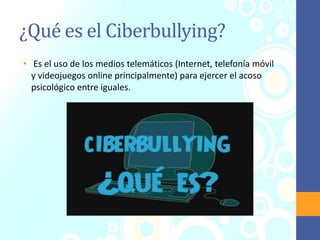 Este documento describe el ciberacoso o ciberbullying, que implica el uso de la tecnología como Internet y teléfonos móviles para acosar psicológicamente a otros. Explica cómo el ciberbullying afecta a las víctimas a través de las redes sociales y tiene consecuencias como la inseguridad, humillación y afectación del desarrollo de la personalidad. También ofrece consejos para prevenir el ciberbullying como cuidar la información compartida en línea y denunciar conductas agresivas, además
