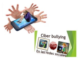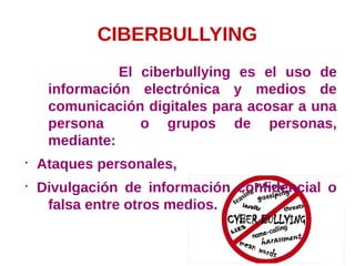 El documento trata sobre el ciberacoso o ciberbullying. Explica que es el uso de medios digitales y redes sociales para acosar psicológicamente a otras personas de forma repetitiva. Esto puede causar daños como ataques de ansiedad, aislamiento y problemas familiares en las víctimas, especialmente entre los jóvenes. Se enfatiza la importancia de prevenir el ciberbullying informándose sobre el tema y poniéndose en el lugar del otro, así como acudir a un adulto en caso de ser víctima.