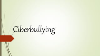 El documento trata sobre el ciberacoso o ciberbullying. Explica que es el acoso a través de medios electrónicos como las redes sociales, y que afecta principalmente a los jóvenes. Identifica algunas características como el anonimato y la repetición, así como los roles involucrados. También describe diferentes tipos de ciberbullying y ofrece consejos para prevenirlo y qué hacer si uno es víctima o testigo, como guardar pruebas, buscar ayuda y bloquear al acosador. Finalmente, da recomendaciones para
