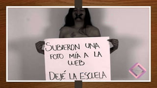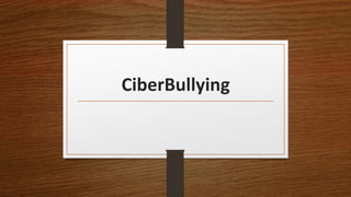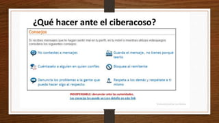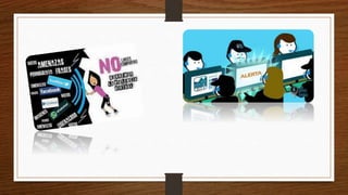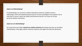 El documento habla sobre el ciberacoso o ciberbullying, definido como el uso de medios electrónicos como internet y teléfonos móviles para acosar psicológicamente a otros. Explica que no incluye acoso sexual de adultos ni casos en los que adultos participan. Describe tres tipos comunes de ciberbullying: grooming, sexting y flaming.