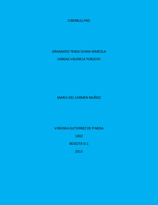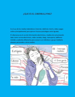 Este documento habla sobre el ciberacoso o ciberbullying. Explica que es el uso de medios electrónicos como internet, teléfonos y videojuegos para acosar psicológicamente a otros. Describe algunas formas comunes de ciberacoso como agresión sexual virtual, mensajes e emails denigrantes, y robo de identidad en línea. Además, recomienda dónde denunciar casos de ciberbullying y señala cambios de comportamiento que podrían indicar que un niño está siendo víctima de acoso escolar