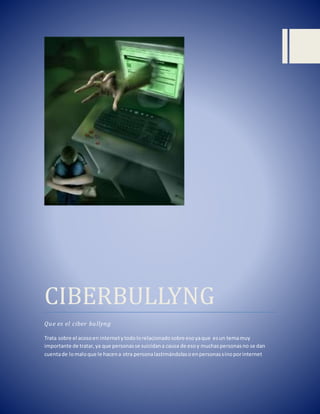 El documento habla sobre el ciberacoso o ciberbullying, que es el acoso psicológico entre iguales a través de Internet y dispositivos móviles. Describe varios tipos de ciberbullying como el arrasement, grooming, sexting, flamming y stalking. También indica algunos signos de que una persona puede estar siendo víctima de ciberacoso como cambios de comportamiento, bajo rendimiento escolar y síntomas físicos. Además, menciona que es importante denunciar los casos de ciberacoso y que