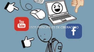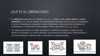 Este documento describe diferentes tipos de ciberacoso, incluyendo el acoso escolar, el grooming, y las tácticas comunes utilizadas por los ciberacosadores. Define el ciberacoso como el uso de medios digitales para acosar a otros de manera repetida, y explica que puede ocurrir en contextos académicos, laborales, sociales y amorosos debido a la ubicuidad de Internet. También detalla los posibles efectos negativos del ciberacoso en las víctimas y la dificultad de hacer cumplir las