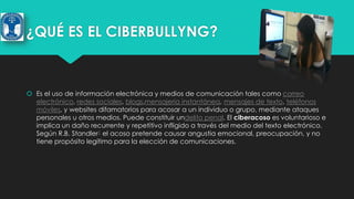 El documento define el ciberacoso como el uso de medios electrónicos como redes sociales y mensajes de texto para acosar a alguien de forma repetitiva e intencional, causando angustia emocional. Describe las características del ciberacoso, incluyendo la difusión de información falsa, el monitoreo de la víctima, y la manipulación de terceros para que también acosan. Finalmente, distingue tres tipos principales de ciberacoso - entre adultos, acoso sexual entre adultos, y acoso escolar entre menores