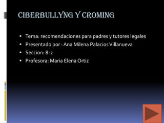 Este documento presenta recomendaciones para padres sobre cómo involucrarse en el uso que los menores hacen de Internet, incluyendo instalar ordenadores en zonas comunes, establecer horarios para el uso y promover un uso responsable de cámaras web. También enfatiza la importancia de la comunicación entre padres e hijos sobre los aspectos positivos y riesgos de Internet, y enseñar a los menores a proteger sus datos personales.