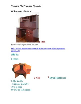 El documento presenta varias cotizaciones para equipamiento de un cibercafé, incluyendo muebles, escritorios, mesas hexagonales, centros de cómputo, y canaletas para distribuir cables. Se proporcionan detalles como medidas, capacidades, y precios unitarios y totales para distintos productos que podrían usarse para equipar un cibercafé.