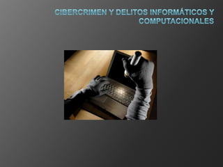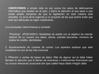 El documento describe varios tipos comunes de cibercrimenes como phishing, apoderamiento de cuentas de correo y filtración de bases de datos. También explica la diferencia entre delitos informáticos, que involucran la obtención ilegal de información accediendo a una computadora sin autorización, y delitos computacionales, que usan la computación para cometer delitos ya existentes como estafas a través de Internet. Además, brinda detalles sobre los protocolos TCP/IP que permiten el intercambio de datos entre computadoras a través