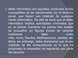 Los delitos informáticos implican actividades criminales que usan medios informáticos de manera indebida. La informática puede ser el objeto del ataque o el medio para cometer otros delitos debido a la facilidad de acceso y manipulación de datos. Existen opiniones disímiles sobre el bien jurídico protegido en los delitos informáticos aunque la legislación ecuatoriana parece proteger el patrimonio. Los delitos informáticos involucran conductas ilícitas donde las computadoras son usadas como medio o fin para atacar bienes