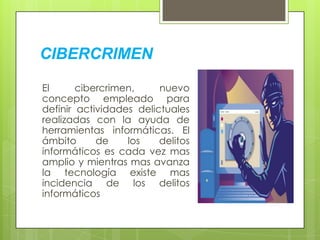 Este documento discute el cibercrimen y los delitos informáticos. Define el cibercrimen como actividades delictuales realizadas con herramientas informáticas. Explica que los delitos computacionales usan medios informáticos para cometer delitos como estafas o robos, mientras que los delitos informáticos implican actividades criminales que hacen un uso indebido de medios informáticos.
