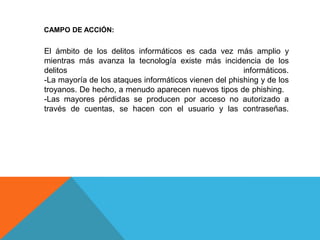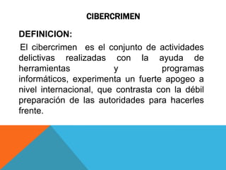 El cibercrimen involucra actividades delictivas realizadas con herramientas informáticas como phishing y troyanos, que causan pérdidas a través de acceso no autorizado a cuentas. El phishing y el spam se usan para robar identidades y datos personales o promover productos de manera masiva. Los delitos informáticos afectan datos e información mientras que los delitos computacionales interrumpen operaciones de computadoras.