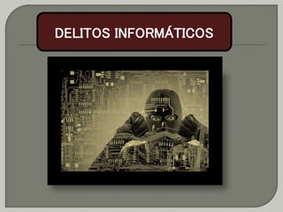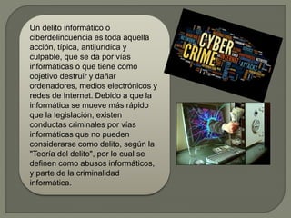 El documento habla sobre los delitos informáticos o ciberdelincuencia. Explica que estos incluyen acciones antijurídicas que dañan ordenadores, medios electrónicos y redes a través de vías informáticas. También menciona que debido a que la tecnología avanza más rápido que la legislación, algunas conductas no pueden considerarse delitos según la ley. Luego procede a describir varios tipos específicos de crímenes informáticos como el spam, fraude, hostigamiento y tráfico