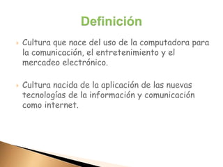 La cibercultura se refiere a la cultura que surge del uso de las tecnologías de la información y la comunicación como Internet. Transforma las formas de comunicación e interacción social a través de la creación de comunidades virtuales y el intercambio de información en línea. También cambia la forma en que compartimos y accedemos al conocimiento.