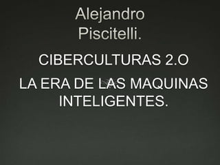 Este documento resume el libro "Ciberculturas 2.0" de Alejandro Piscitelli, el cual explora los cambios tecnológicos asociados con la era de las máquinas inteligentes y la cuarta discontinuidad tecnológica. El libro analiza temas como la inteligencia artificial, la nanotecnología, las imágenes digitales, la realidad virtual, el ciberespacio y los mundos virtuales. También examina cómo Internet ha revolucionado la sociedad y cómo continúa evolucionando.