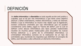 Este documento define los ciberdelitos como acciones anti jurídicas y culpables que se dan por vías informáticas o que tienen como objetivo dañar ordenadores, medios electrónicos y redes de Internet. Explica que los ciberdelitos son actividades ilícitas que se cometen mediante el uso de computadoras o que tienen por objeto causar daños a sistemas informáticos. Finalmente, enumera tres tipos de ciberdelitos reconocidos por Naciones Unidas: manipulación de datos de entrada, daños o modificaciones a programas o datos computariz