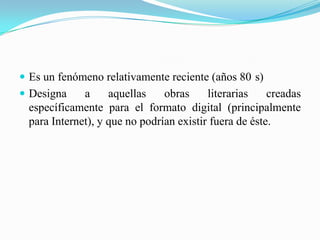 La literatura hipertextual es una forma relativamente nueva de literatura creada específicamente para formatos digitales e Internet. Incluye narrativas no lineales como la hiperficción constructiva o explorativa, que permiten al lector modificar o elegir cómo explorar el texto. Este tipo de literatura permite vincular textos, imágenes, videos y más información relacionada a través de hipervínculos.