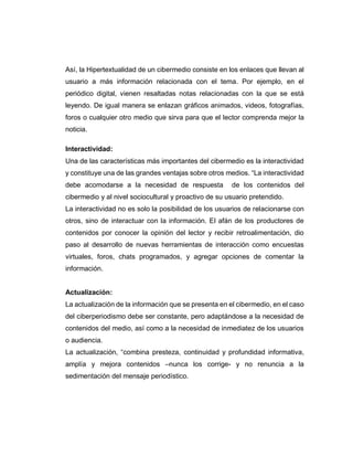 Un cibermedio es un medio de comunicación e información que utiliza Internet como plataforma de difusión para publicaciones masivas. Se caracteriza por su multimedialidad, hipertextualidad, interactividad y capacidad de actualización constante. Integra texto, video y sonido y permite enlaces a más información relacionada a través de gráficos, videos y otros medios. Además, fomenta la interacción con los usuarios a través de encuestas, foros y comentarios para obtener retroalimentación.