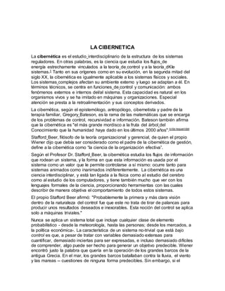La cibernética es el estudio interdisciplinario de los sistemas de control y comunicación en organismos vivos, máquinas y organizaciones. Examina cómo los sistemas se regulan a sí mismos mediante retroalimentación y cómo interactúan con su entorno. La cibernética se centra en funciones como el control y la comunicación, y se aplica tanto a sistemas físicos como sociales. Tiene como objetivo desarrollar un lenguaje y técnicas para estudiar problemas de control y comunicación de manera general.