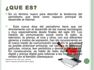 El ciberperiodismo es una nueva forma de periodismo que se desarrolla principalmente en Internet. Utiliza las nuevas tecnologías para transmitir información de forma digital a través de medios como la radio, televisión y prensa en línea. Internet permite la producción y difusión de información de manera más inmediata e interactiva.