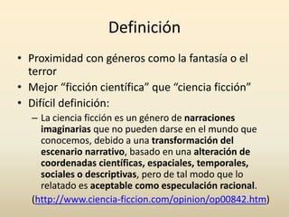 El documento analiza la evolución de la ciencia ficción, destacando su dificultad de definición y los subgéneros como la ciencia ficción dura y blanda, así como el impacto de William Gibson y el ciberpunk en la literatura. Se exploran las características del ciberpunk, incluyendo avances tecnológicos y la marginalización social, y se argumenta su relevancia en el contexto cultural actual. Finalmente, se destaca 'Neuromante' y la trilogía del 'sprawl' como obras clave en la narrativa ciberpunk.