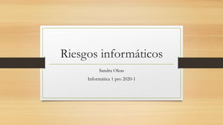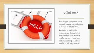Este documento describe los principales riesgos informáticos como la ingeniería social, malware y spyware, y explica que ocurren cuando compartimos información personal en internet sin protegerla adecuadamente. También resume algunas leyes relacionadas con los delitos informáticos en Colombia y estadísticas que muestran un aumento en los casos denunciados. Para prevenir riesgos, recomienda mantener software actualizado y antivirus, y ser cuidadoso con la información personal compartida online.