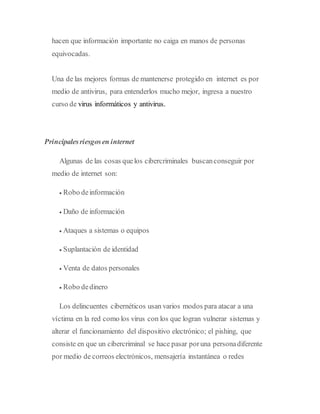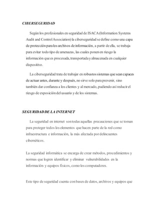 La ciberseguridad se define como una capa de protección para archivos de información que trabaja para evitar amenazas y riesgos. Incluye sistemas robustos que actúan antes, durante y después de incidentes para prevenirlos y dar confianza a clientes. La seguridad en internet incluye precauciones para proteger infraestructura e información de delincuentes cibernéticos mediante métodos, procedimientos y normas. Aunque las empresas tengan buena tecnología y expertos, es fundamental considerar los estándares éticos de quienes