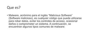 Este documento describe varios tipos de malware, incluyendo spyware, adware, bots, ransomware, scareware, rootkits, virus, troyanos y gusanos. También explica técnicas comunes de ingeniería social utilizadas para distribuir malware, como pretextos, seguimiento y quid pro quo. Además, detalla métodos para descifrar contraseñas Wi-Fi como fuerza bruta, ingeniería social y monitoreo de red.